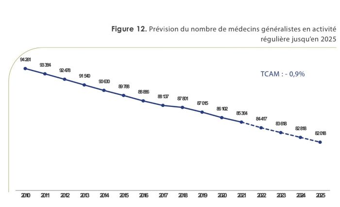 Selon les prévisions du CNOM (Atlas de la démographie médicale 2021), le nombre de médecins généralistes régulièrement installés, en baisse depuis de nombreuses années alors que la population augmente, devrait diminuer de -4% entre 2021 (85 364) et 2025 (82 018).