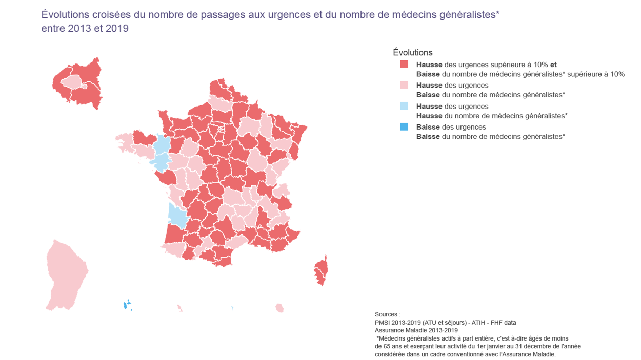 Cette situation a des répercussions fortes et bien connues, notamment sur l’hôpital public. À titre d’exemple, et à l’exception de 5 départements, les départements français ont tous connu ces dernières années une hausse des passages aux urgences et une baisse du nombre de médecins généralistes, de plus de 10% dans les deux cas pour plus de la moitié d’entre eux.