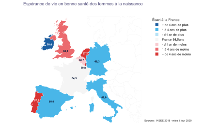 L’espérance de vie en bonne santé à la naissance en France se situe au niveau de la moyenne européenne (63,4%) mais reste bien en-deçà de nos voisins (entre 3 et 5 ans de moins qu’en Italie, en Espagne et en Irlande par exemple).
