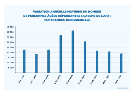 S’agissant des personnes âgées en situation de perte d’autonomie, les projections divergent selon les hypothèses (notamment les progrès de la médecine ou l’efficacité des actions de prévention) mais les différentes fourchettes conduisent à retenir une hausse de 200 000 à 400 000 personnes âgées en situation de perte d’autonomie à l’horizon 2030 (soit environ + 20 000 / an) et une progression plus forte encore dans la décennie 2030 – 2040 (jusqu’à + 40 000 / an).